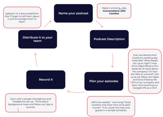 Let’s take the example of Company X, a large professional services firm. They have identified the need to keep employees better informed of company news and to improve the CEO (‘Caroline’) profile internally. Caroline’s weekly email has very low engagement rates yet the People Survey is showing there is an issue with the internal culture, wellbeing and communication. An internal podcast provides a unique opportunity for employees to hear from Caroline in a more informal and intimate way. Here are the 5 simple steps to follow to plan the show:
